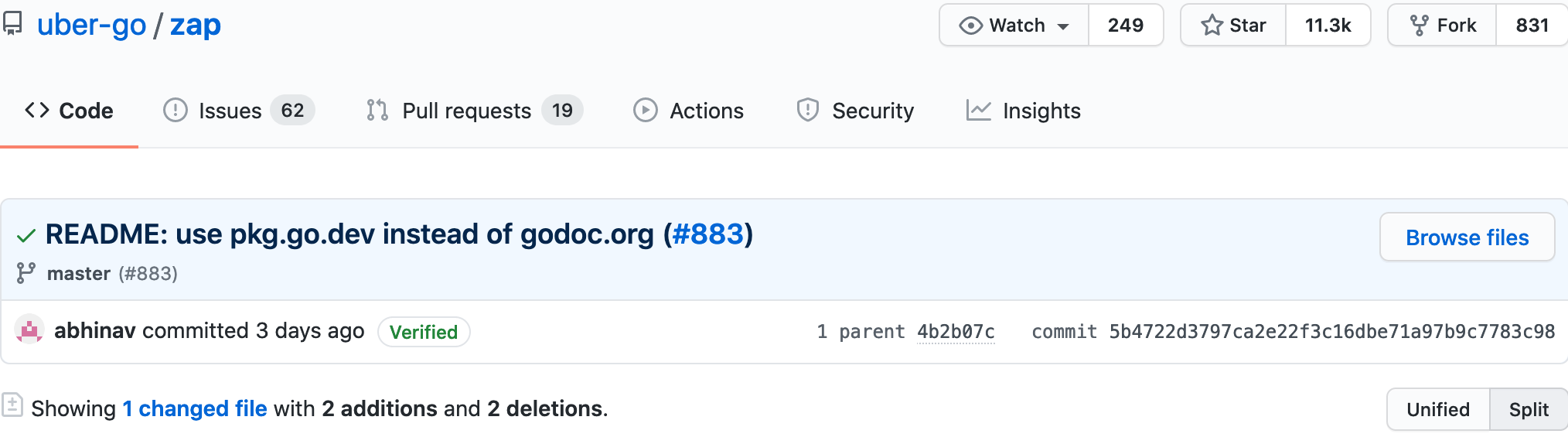 go get go.uber.org/zap@5b4722d3797ca2e22f3c16dbe71a97b9c7783c98Now the newly installed dependancy can be easily used. Create a new main.go file containing the following code
