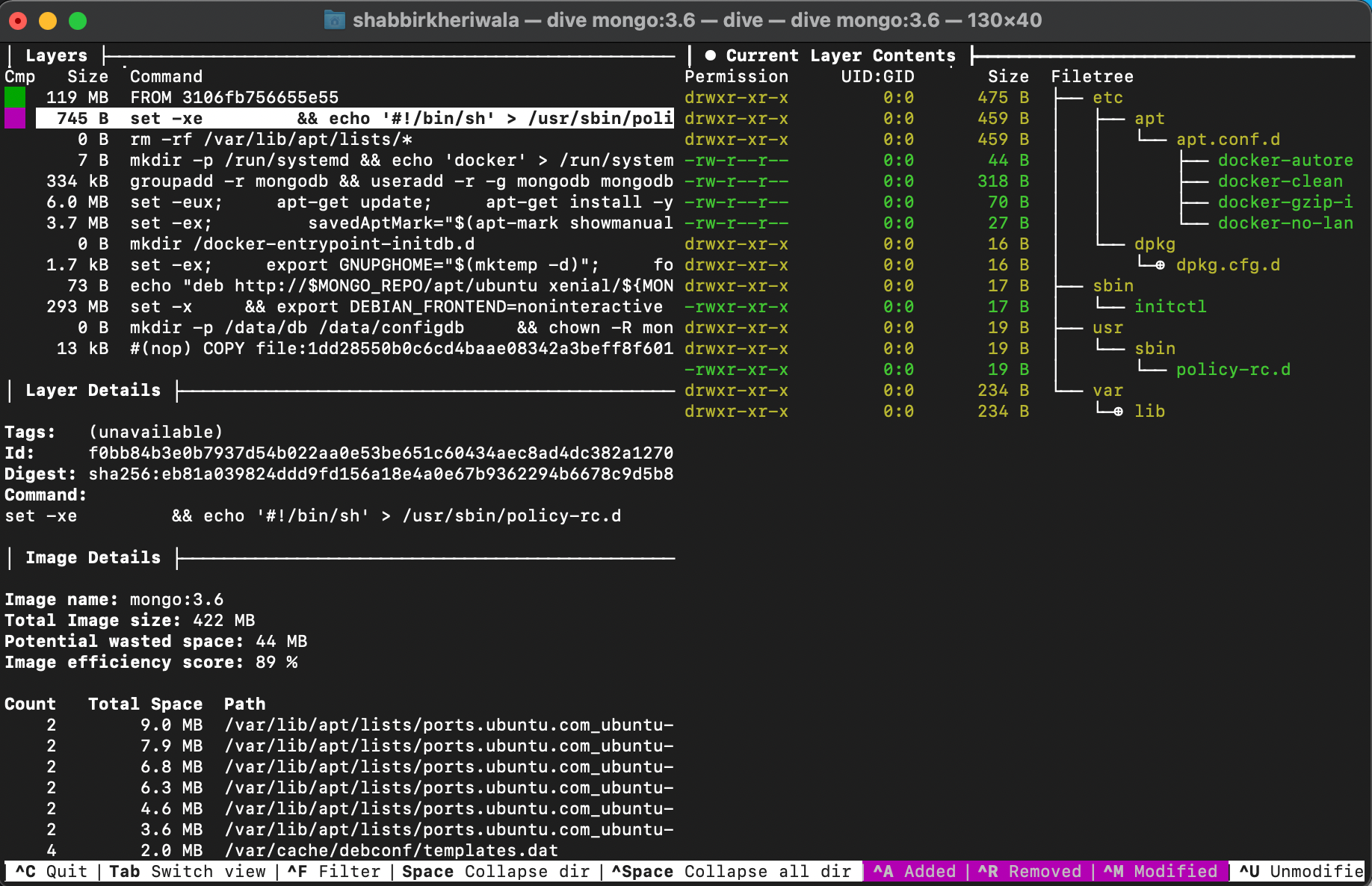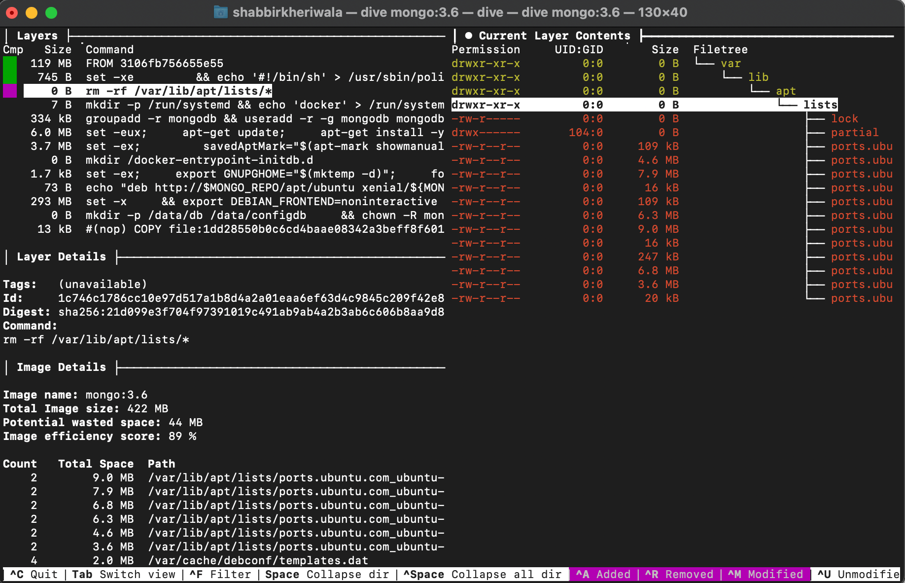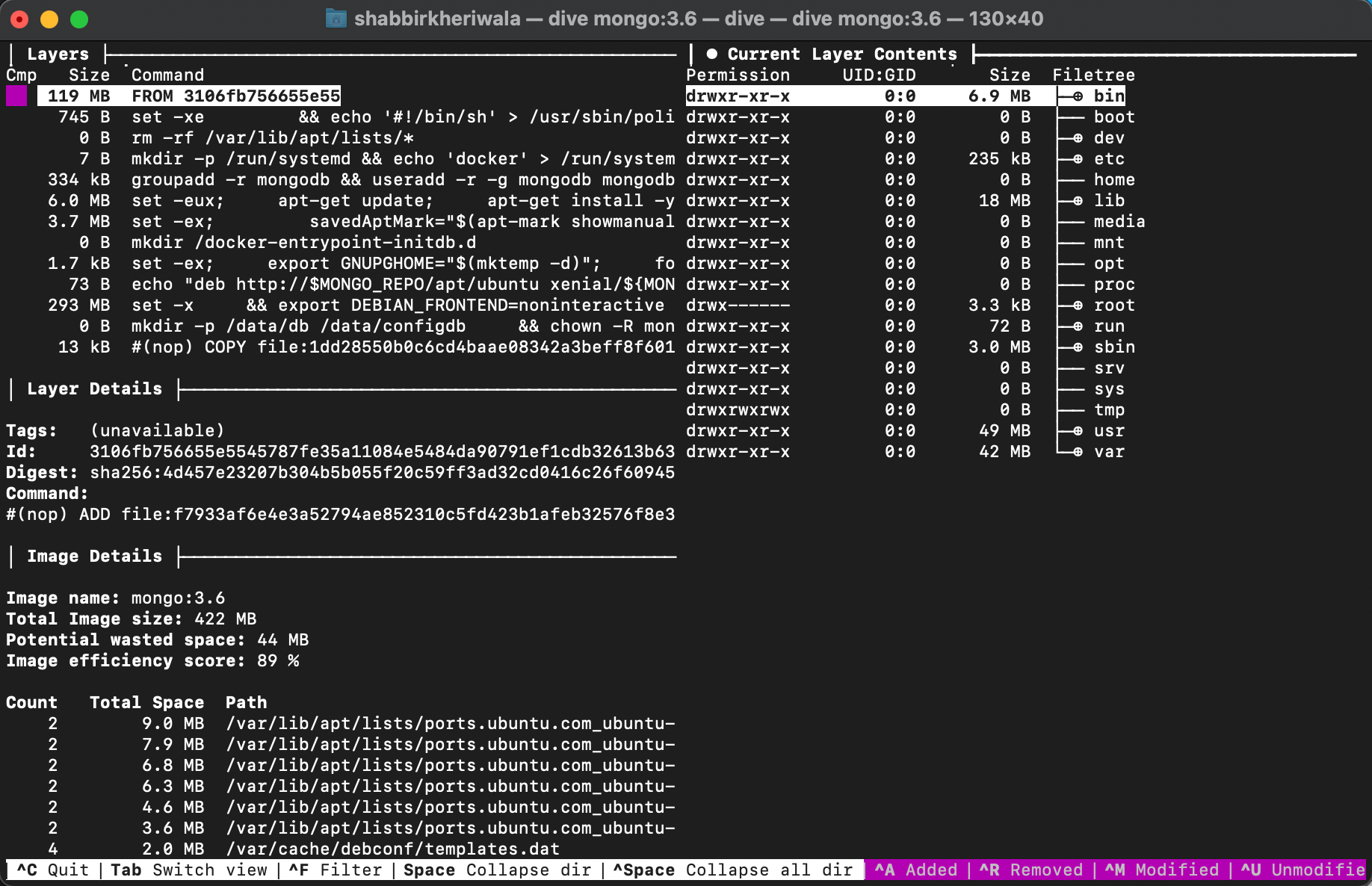 $ dive build -t <some-tag> .When you run the dive command on a docker file what you see is something like this on the terminal. In the below command we fetch the mongo:3.6 image file.