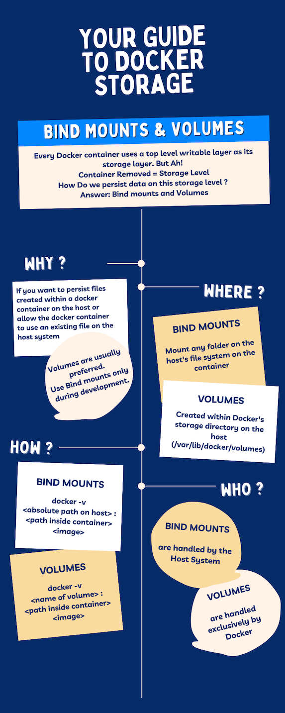 There! You have successfully used bind mounts and volumes to ensure data persistence for containers. Both of these will allow you to share data between the container and the host. If you use Linux, you can also use a third type called the tmpfs mount which will use the host's memory instead of the container's writable layer. But here too, the data will not be persisted when the container is removed. Kinda misses the purpose for here right?