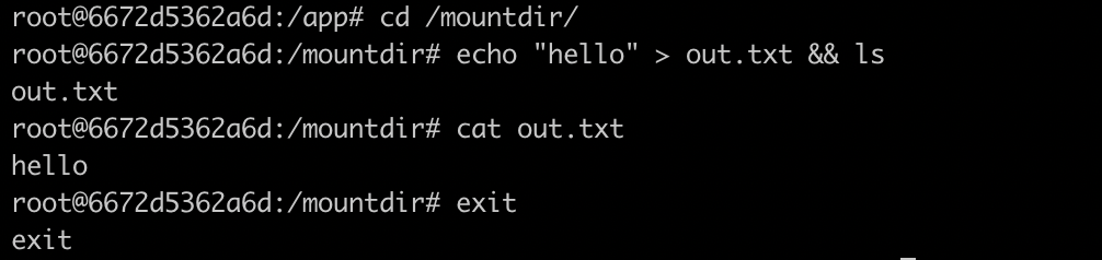 - Exit the container and check the contents of the mountHost directory that you used for the bind mount. Surely, you'll see the out.txt file created there.