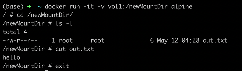 docker run -it -v vol1:/newMountDir alpineNow if you list the contents of "newMountDir", you'll find the out.txt file already there