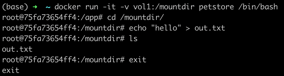 docker run -it -v $(pwd):/app petstore /bin/bash- Once you are inside the container and have the bash shell running. Navigate into the /mountdir folder and create the out.txt file.