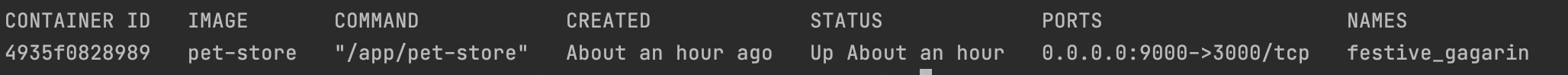 docker run -d -p 9000:3000 -e DB_HOST=<YOUR-IP-ADDRESS> pet-store