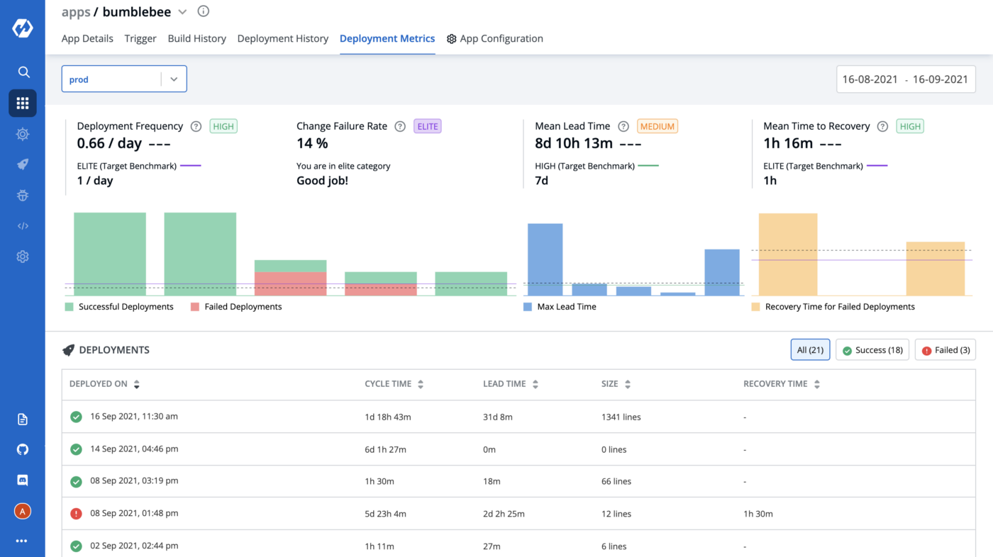 Again all these metrics come bundled with Devtron (voila!), so you do not have to spend any extra time in capturing or projecting it. And these metrics are available for each service which means each service owner can easily figure out the areas where they are excelling or lacking in terms of agility. For example, we were able to quickly improve the TAT for one of our services named bumblebee using these metrics.