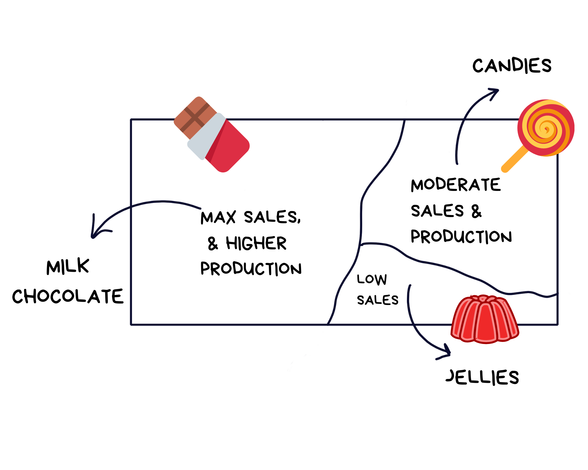 Since Milk chocolates were in high in demand, they were given a larger quota as compared to Jellies which had a lower share in the overall sales.