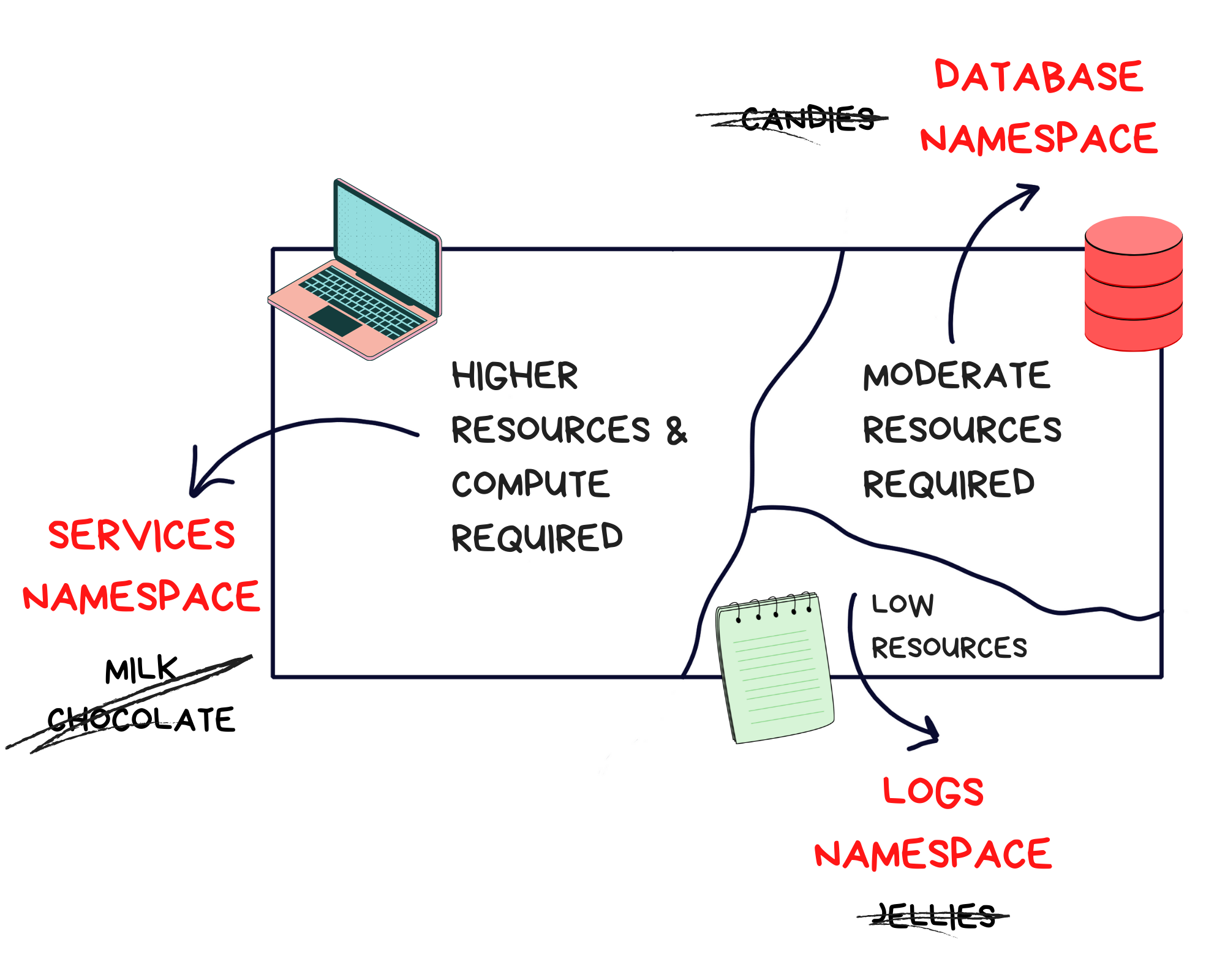 That's how namespaces work too. A NAMESPACE is a way in which a cluster's resources can be divided up between users or teams. So there can be one namespace dedicated to each of the services,database and the logging team in our previous example.