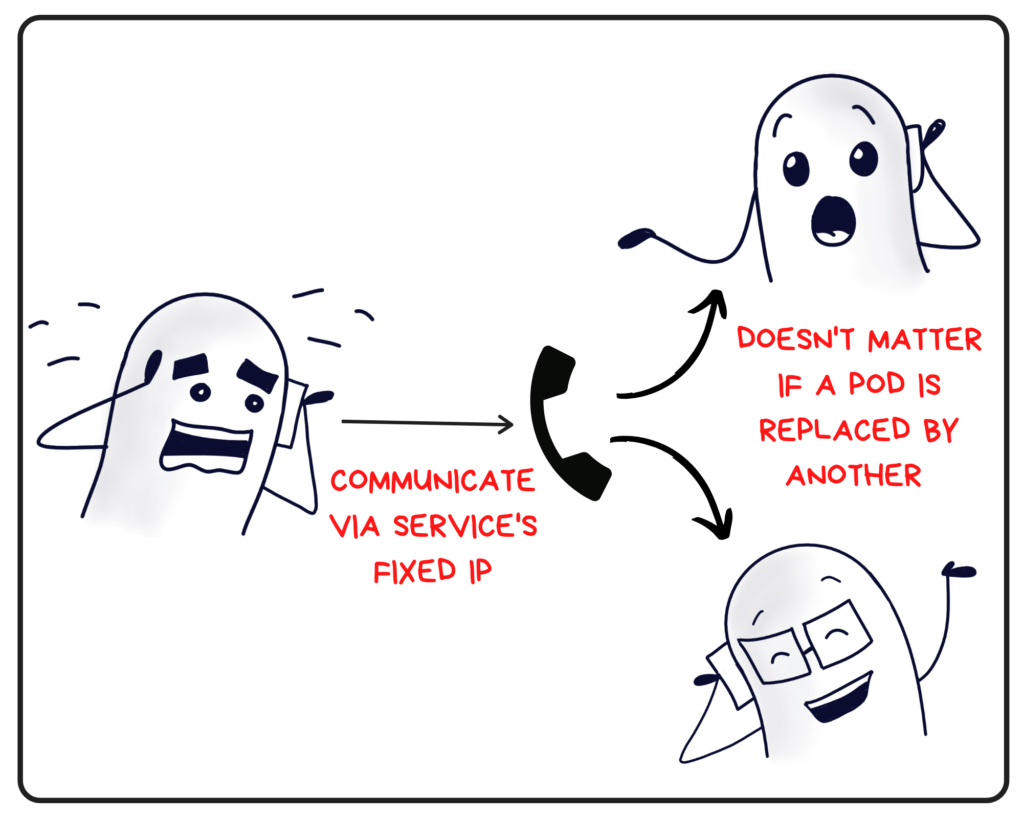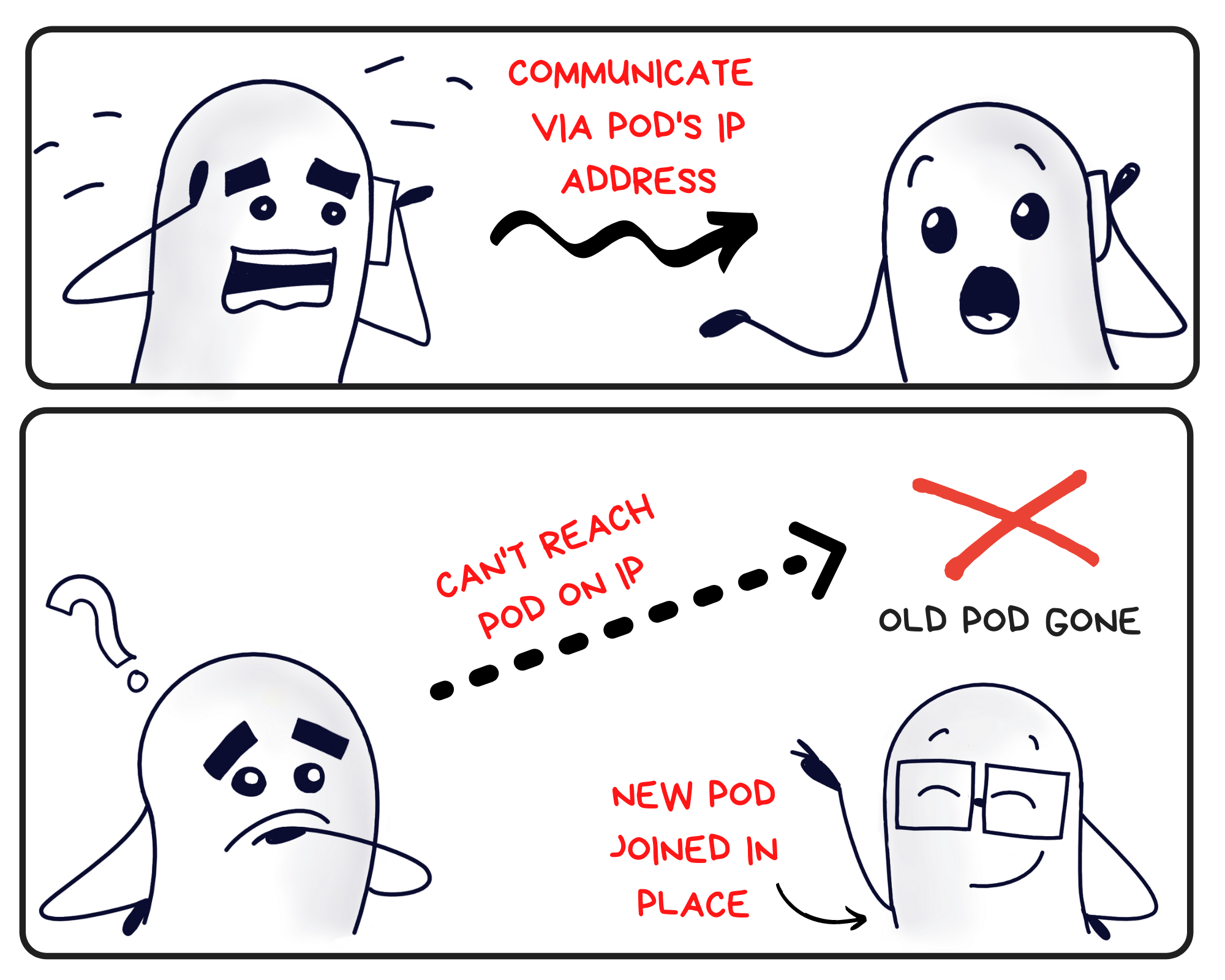 Ah, pods are ephemeral creatures. So if a pod dies, a new one is created to take its place. But a new pod means a new IP address. And when that happens, the other pods don't know about this change and keep trying to connect to the older IP.