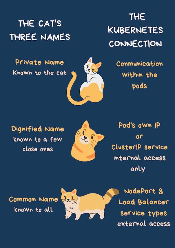 And what about the cat and the names? The cat is actually a pod and the cat's name represents the different ways pods can communicate.
