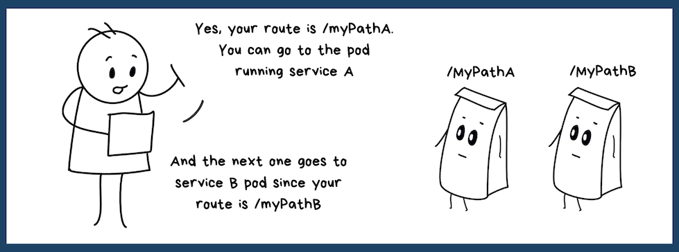 route all traffic on the path "/mypathA" to the pod running microservice A and all traffic on "/myPathB" goes to service B.