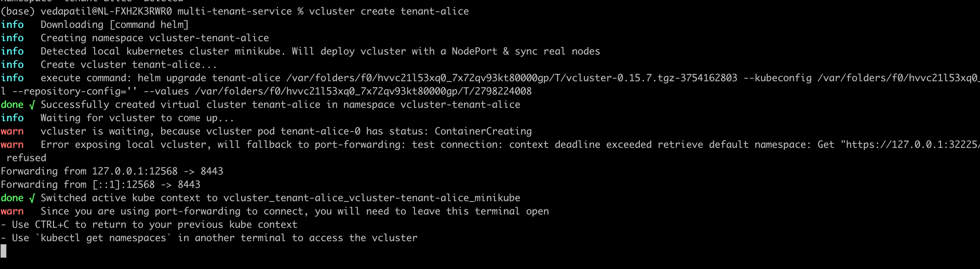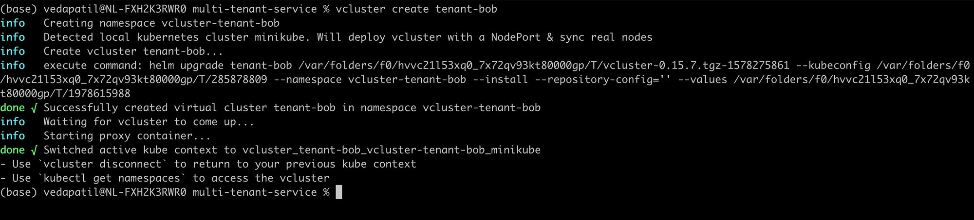 The vcluster create [tenant_id] command will spin up a virtual cluster for you in a newly created namespace called vcluster-[tenant_id] . Then, it sets up the control plane for the virtual cluster and syncs with the host cluster (your local cluster in this case). You can take a look at your vclusters using: