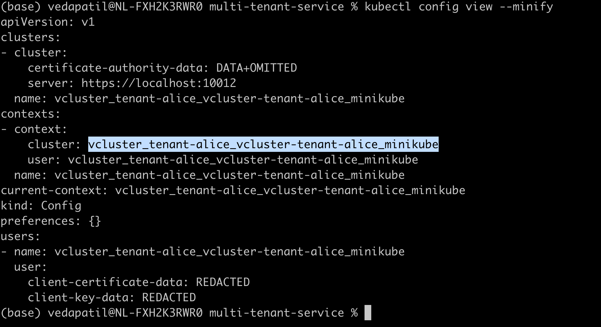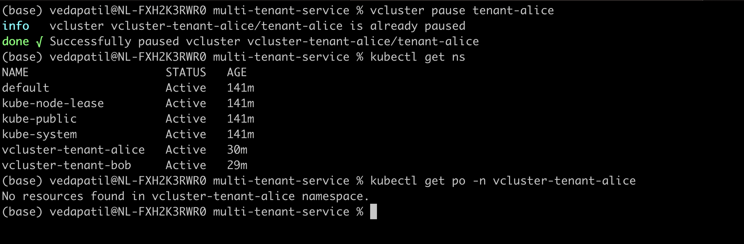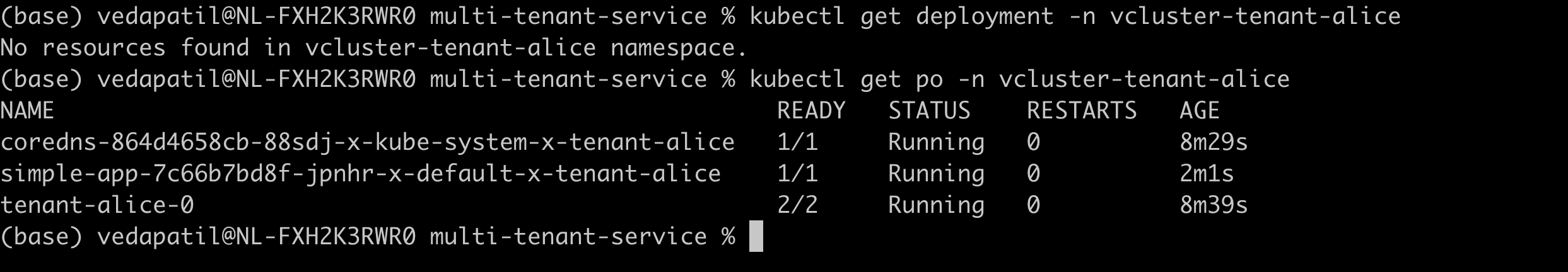 Now you are working on the vcluster "tenant-alice". If you still aren't convinced, and you want to be extra sure, you can always do a quick sanity check by running
