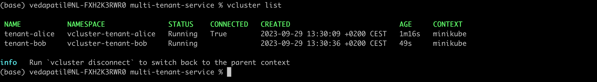With the list command, you also get a good overview of the status of the vclusters, their namespaces, and which particular vcluster you are connected to.
