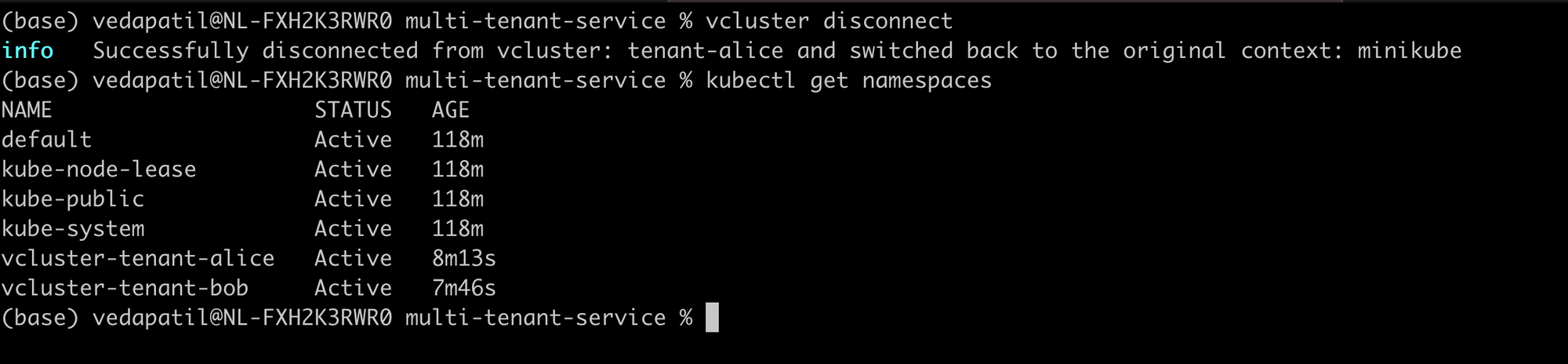 See that? you have the usual namespaces and then you have an additional namespace for tenant-alice and one for tenant-bob vcluster. This is where your clusters are running.