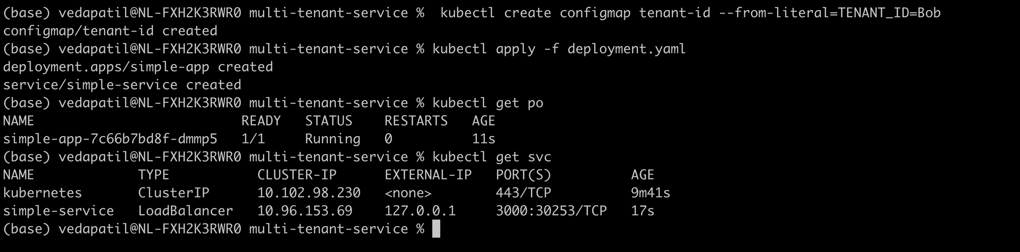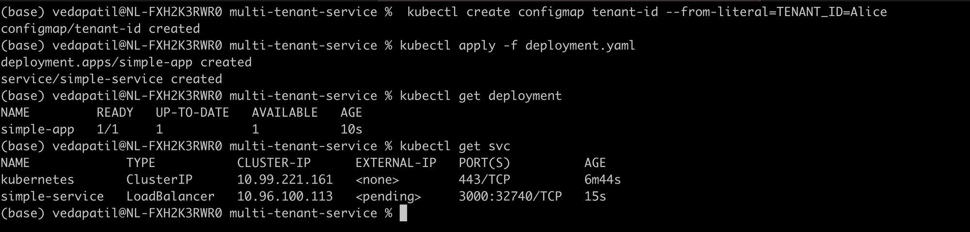 Now we proceed with our usual deployment process. First, we create a configmap that contains the tenant_id i.e. Alice. And then deploy the app and the service using our YAML specification files.