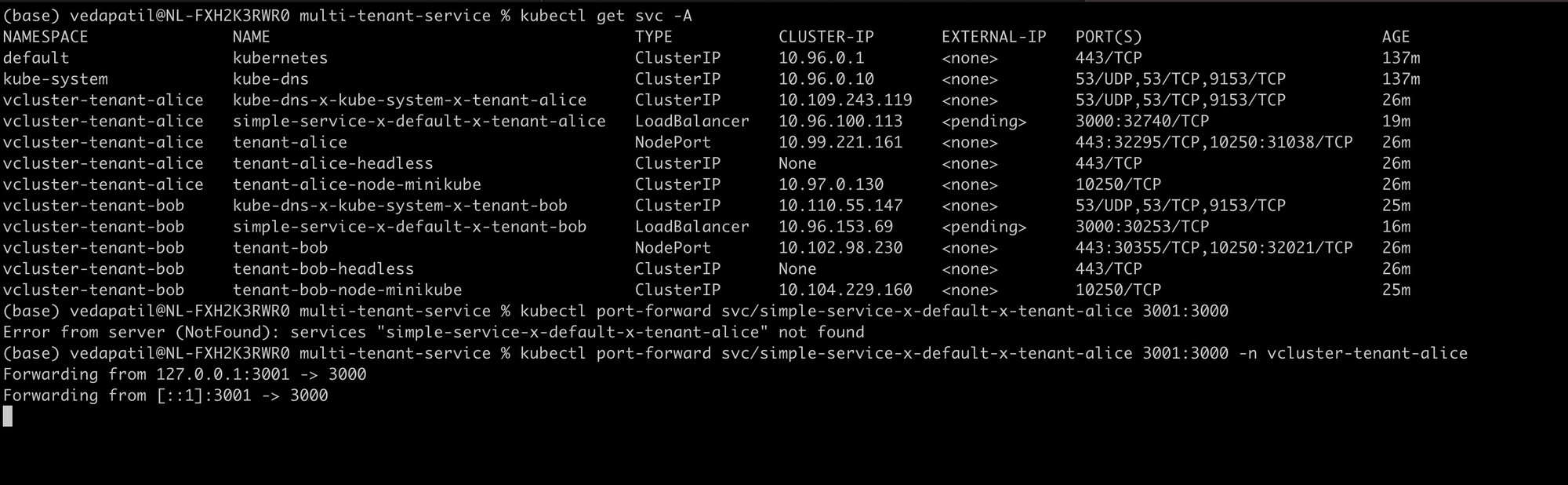 We use a simple port forward on the services that we have deployed. One port-forward for tenant-alice on port 3001 and one for tenant-bob on port 3002