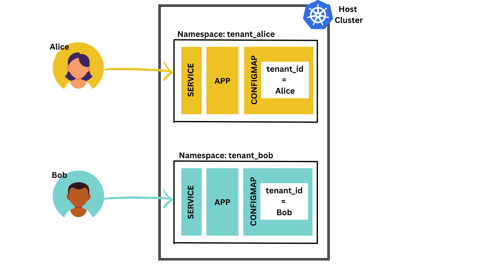 - A separate namespace for both Alice and Bob. Let's call them "tenant_alice" and "tenant_bob"