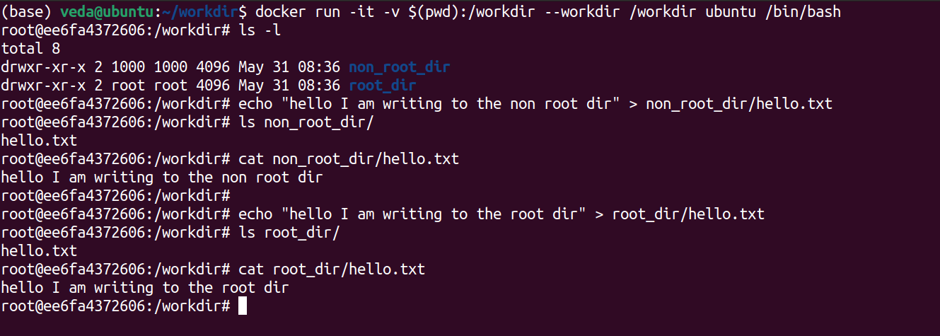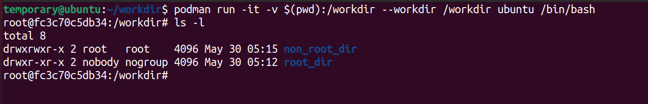 Once you're inside the image, do als -lto check the contents of theworkdirfolder. Notice something ? Why is the user for thenon_root_dirshown as root ?