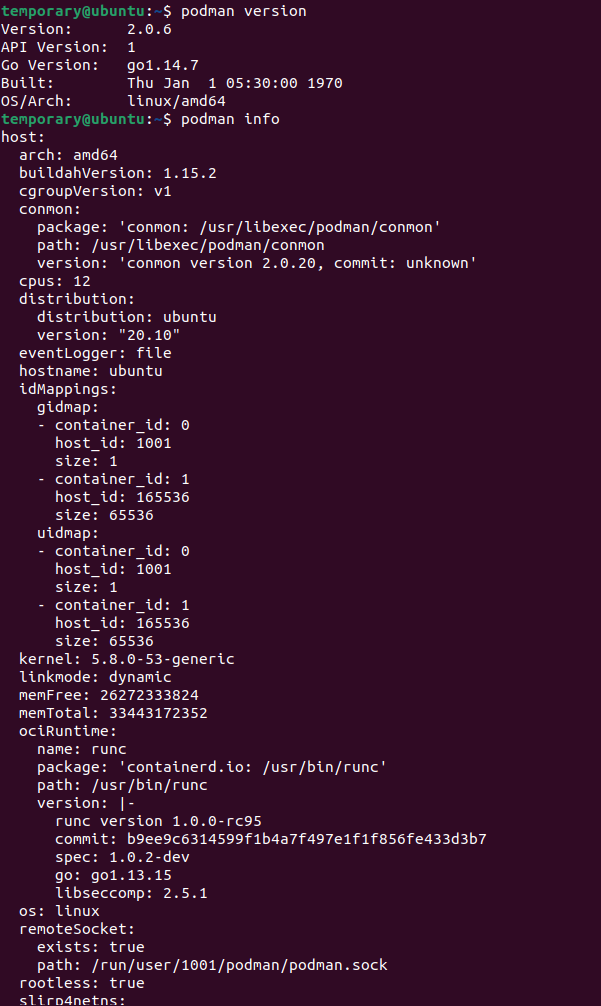 Yes! We saw the rootless = true flag in podman info . But we are not convinced! We want to verify this "rootless" behavior. So we're going experiment around a bit.
