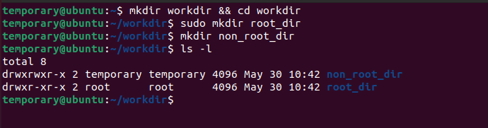 Next, within the workdir we create two sub directories, which we are going to call non_root_dir and root_dir . And as the name suggests, root_dir will belong the root user.