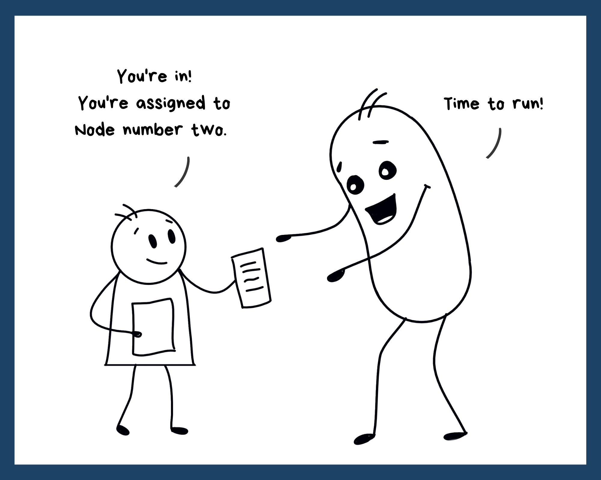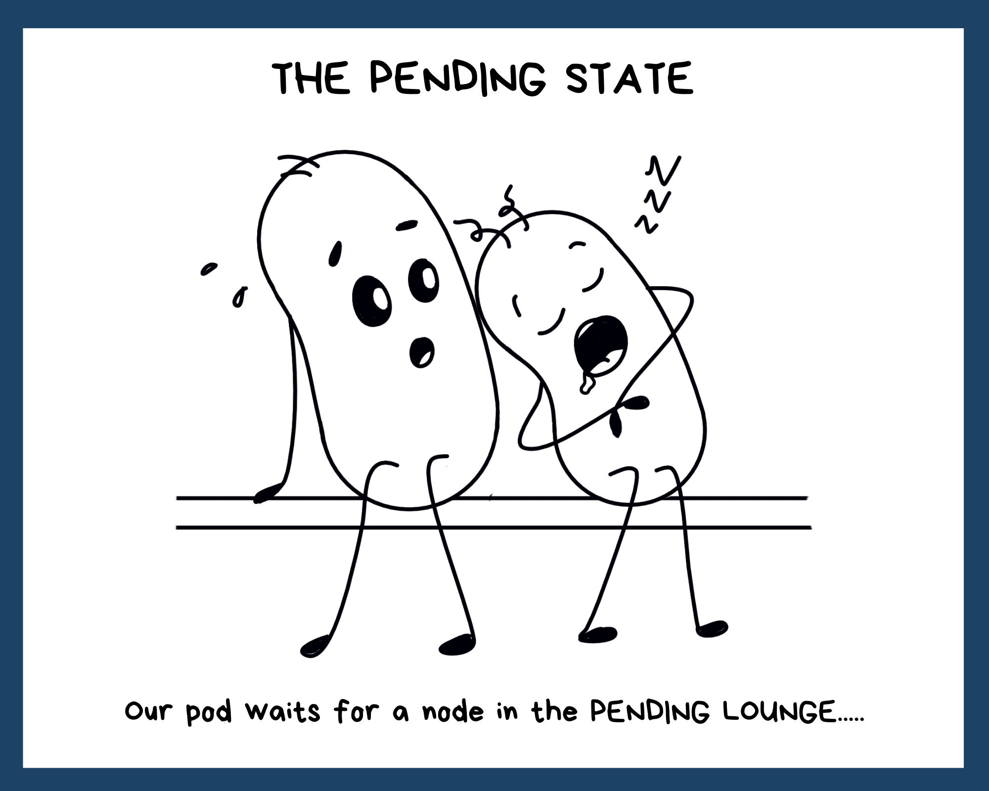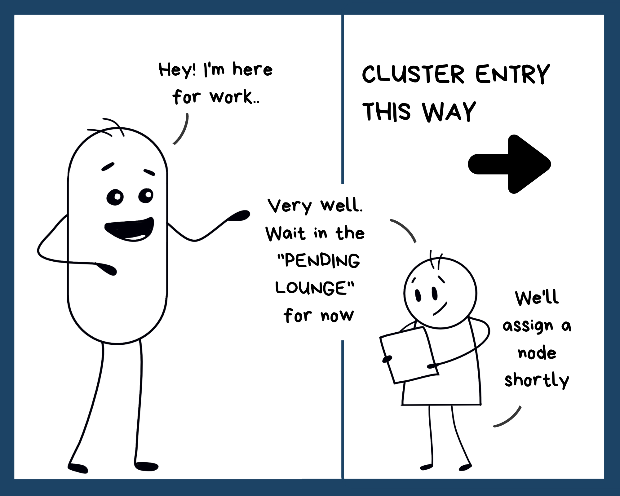 Our pod walked up to the cluster door because he wanted work. There was always some work that had to be done on the cluster. But first, the cluster scheduler (we'll tell you about this guy later) had to decide which node to assign our pod to. That took some time. Meanwhile, our pod waiting in the lounge.