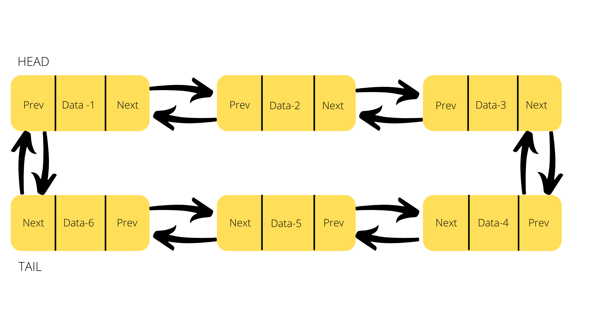 Building on this variation of Linked List, if the Tail node(last node) in a Doubly Linked List has it's NEXT pointer pointing to the Head node(first node) and the PREV pointer of the Head node(first node) points to the Tail node(last node) then this type of a Linked List is called a Circular Linked List.