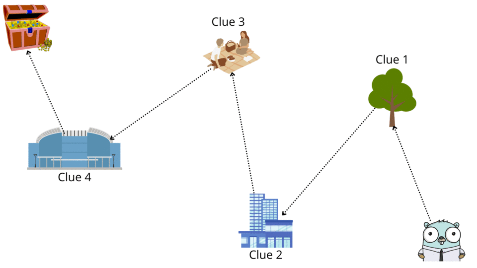 Guess what?It's Gopher's birthday and as part of his birthday surprise his friends have organised a game of Treasure Hunt.As part of this game Gopher has to go around the city to collect clues and small gifts which will eventually lead him to the main gift.Each clue reveals the location of the next clue and so on until the final location where Gopher will receive his main gift.(Pssst!......All his friends are hiding at the final location for a surprise birthday party!)