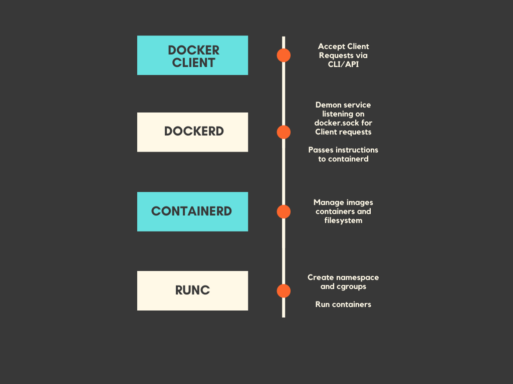 containerd is used as a high level runtime and is mostly responsible for all the container management tasks. It usually pulls the images, unpacks them and then passes over the mantle to runc. - docker-runc