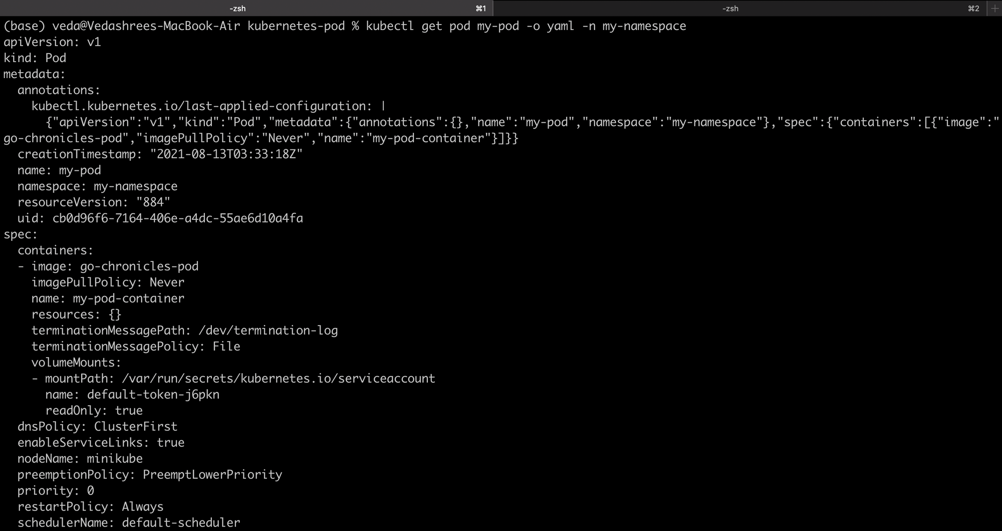 docker build -t go-chronicles-pod .Once, this is done, let's start with the manifest file. The first three sections i.e. API version, kind, and metadata are pretty easy to fill out. We want a pod called "my-pod" in a namespace called "my-namespace".