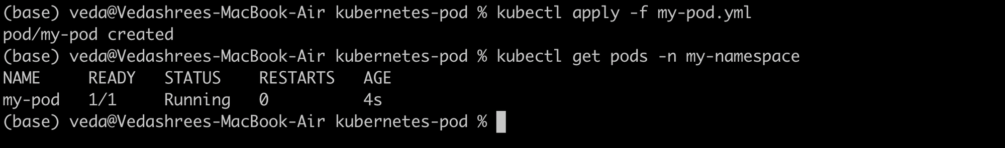 kubectl apply -f my-pod.ymlOn successful creation, you'll see a message