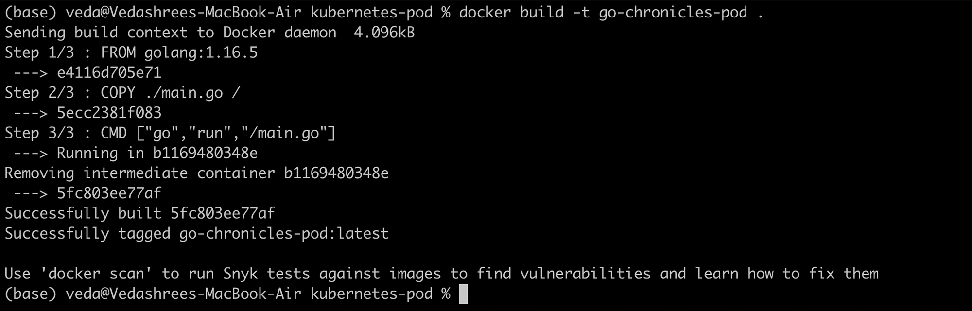 minikube startAnd then, we run the docker build command from our working directory where we've saved the main.go file