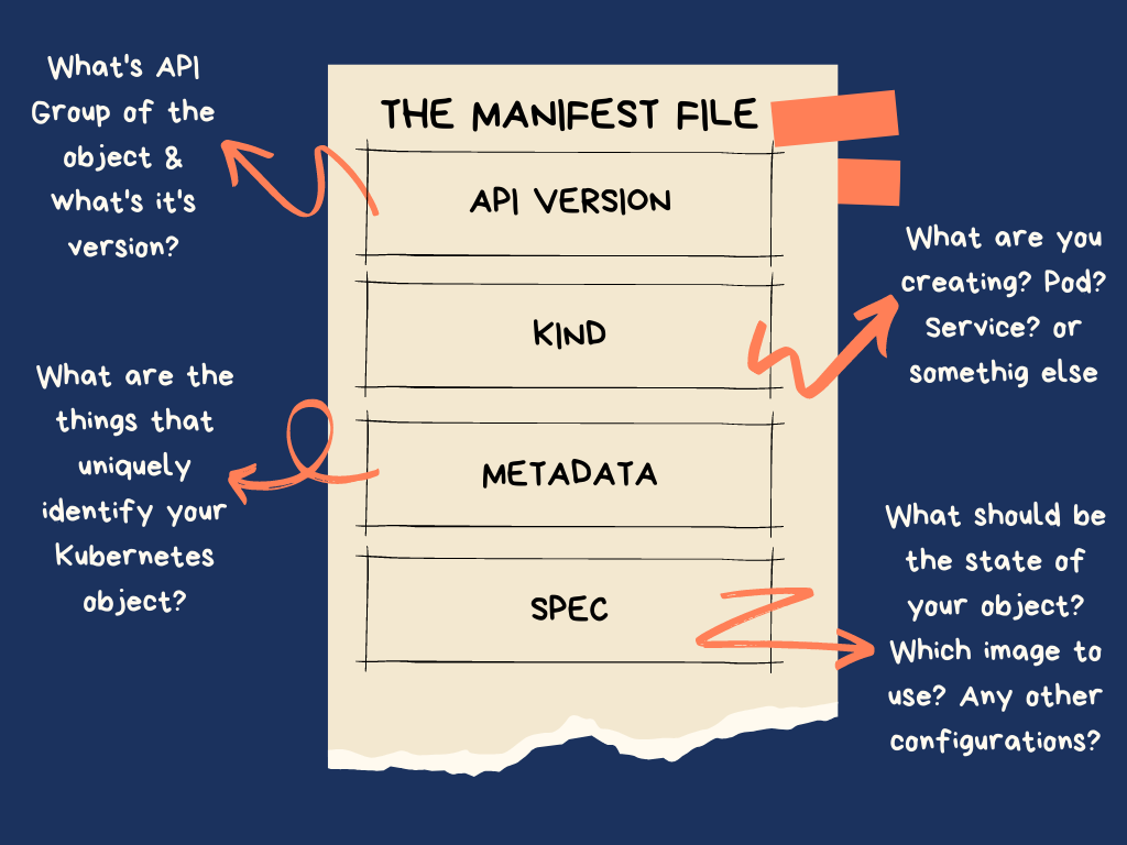 When creating any resource on Kubernetes, or maybe even modifying or deleting any resource, we create a specific file called the Manifest file. It's no rocket science. It's just a plain simple text file that is written in YAML or JSON format.